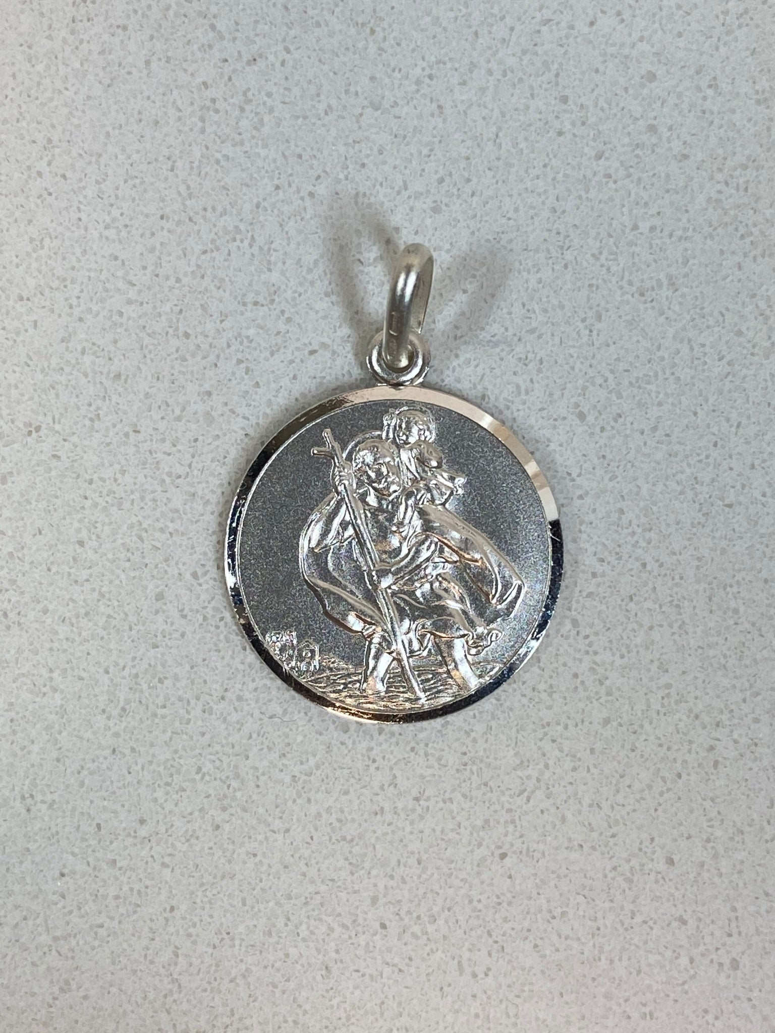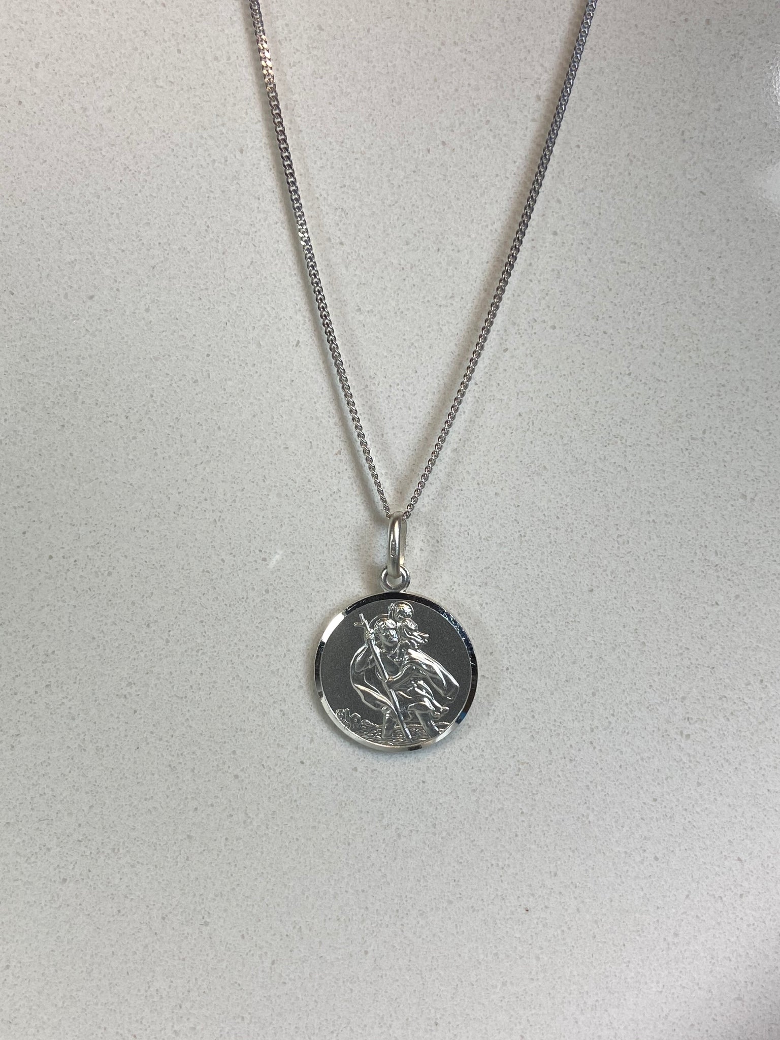 Diamond cut Sterling silver St. Christopher pendant with matte finish. The accompanying chain is sterling silver and rhodium plated to prevent the chain from ever tarnishing!